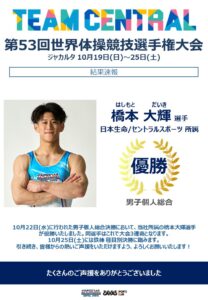 第53回 世界体操競技選手権大会 男子個人総合(10月22日)において、