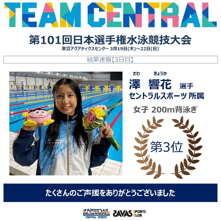 < 競泳/飛込 >【3日目速報】 第101回日本選手権水泳競技大会 / 翼ジャパンダイビングカップ 澤響花選手が銅メダル獲得!